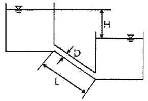 79. 그림과 같이 두 수조에 지름(D) 250mm, 길이(L) 200m인 단일 직선관로가 연결되어 있다. 관의 마찰손실계수가 0.03, 두 수조의 수면차(H)가 4m, 미소손실계수의 합이 1.5 일 때, 흐르는 유량(m3/s)은 약 얼마인가?