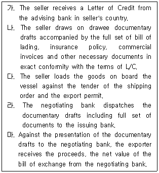 26. 신용장 방식에 의한 아래 수출절차의 내용을 순서대로 바르게 나열한 것은?