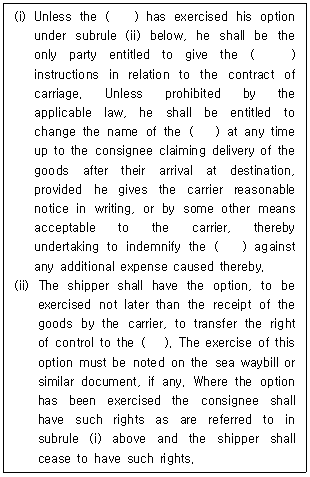 28. 해상화물운송장에 관한 CMI 통일규칙(CMI Uniform Rules for Sea Waybills, 1990) 제6조 '운송물처분권(Right of Control)'에 관한 내용이다. ( )에 들어갈 용어를 순서대로 바르게 나열한 것은?