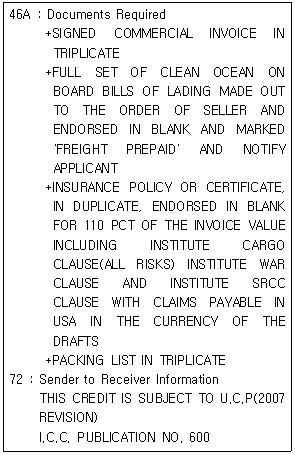 33. 화환신용장 발행 Format(MT 700)을 사용하여 발행된 다음 신용장의 설명으로 옳은 것은?