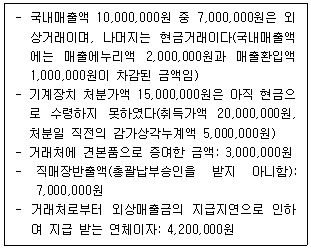7. 다음은 자동차부품 제조업을 운영하는 내국법인 (주)A의 거래내역이다. 부가가치세 과세표준은 얼마인가? (단, 제시된 조건에서 부가가치세는 포함되지 않음)