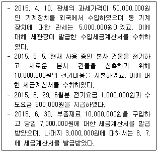 14. 자동차부품을 제조하는 ㈜A의 2015년 제1기 확정신고 시 공제받을 수 있는 매입세액은 얼마인가? (단, 아래의 금액에는 부가가치세가 포함되지 아니함)