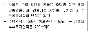 11. 사업자 甲은 국토의 계획 및 이용에 관한 법률 제6조에 따른 도시지역 밖에 임대용 건물 1채를 보유하고 있으며 이를 乙에게 임대하고 있다. 임대부동산의 내역이 다음과 같을 때 부가가치세법상 과세되는 건물과 토지의 면적으로 옳은 것은?