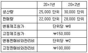 37. 20×1년 초에 설립된 (주)관세는 단일제품을 생산하여 단위당 ₩30에 판매하고 있다. 20×1년과 20×2년의 생산 및 판매에 관한 자료는 다음과 같다.