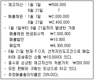 16. (주)관세는 20×1년 8월 21일 발생한 홍수로 인하여 보유하고 있던 재고자산이 손상되었다. (주)관세의 20×1년 회계자료 중 일부는 다음과 같다. 홍수로 인한 재고자산의 손실추정액은 얼마인가?