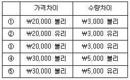 35. (주)관세는 표준원가를 이용한 전부원가계산제도를 적용하며, 20×1년 3월 1일에 생산 및 영업을 개시하였다. 20×1년 3월 중 900단위를 생산에 착수하여 당월에 모두 완성하였으며, 이 중 800단위를 판매하였다. 20×1년 3월 중 직접재료 2,000kg을 ₩130,000에 구입하였으며, 직접재료의 당월말재고량은 100kg이다. 당월말 제품계정에 포함된 표준직접재료원가는 ₩10,000이며, 제품 단위당 표준직접재료소비량은 2kg이다. 20×1년 3월의 직접재료원가의 가격차이와 수량차이는 각각 얼마인가? (단, 직접재료원가의 가격차이는 구입시점에 계산하며, 월말재공품은 없다.)