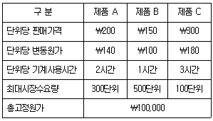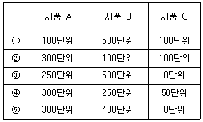 이 회사의 월 최대 사용가능한 기계시간이 1,000시간으로 제약되어 있는 경우, 영업이익을 극대화할 수 있는 최적제품배합으로 옳은 것은?