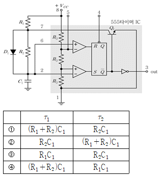11. 다음 555타이머 IC를 활용한 구형파 발생 회로가 정상동작할 때, 커패시터 C1의 충전속도를 결정하는 시정수 τ1과 방전속도를 결정하는 시정수 τ2는? (단, 모든 소자는 이상적이다)