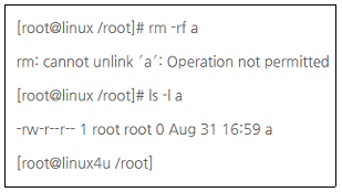 56. Linux에서 root 권한 계정이 ′a′ 라는 파일을 지우려 했을때 나타난 결과이다. 이 파일을 지울 수 있는 방법은?