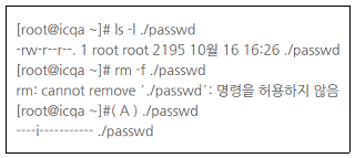 30. 서버 관리자 Kim 사원이 Linux 서버의 ′/root′ 디렉터리를 점검하던 중 ′/etc/passwd′ 파일이 ′/root′ 디렉터리에 복사된 것을 발견했다. ′/root/passwd′ 파일을 삭제하려 했으나 삭제되지 않았다. (A) 명령어로 파일 속성을 확인한 결과, 해당 파일에 ′i′ 속성이 설정되어 쓰기 및 삭제가 불가한 것을 확인했다. 해당 명령어 (A)는?