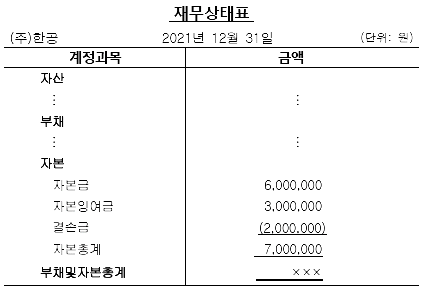 7. (주)한공은 결손금 2,000,000원을 보전하기 위하여 2021년 12월 31일 200주(액면 금액 10,000원)의 무상감자를 실시할 예정이다. 무상감자 전 자본 내역이 다음과 같을 때 무상감자 후 자본(총계)은 얼마인가?