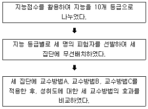 55. '교과태도에 대한 교수방법의 효과가 성에 따를 것이다'는 가설을 검증하기 위해 활용할 수 있는 가장 적합한 실험설계는?