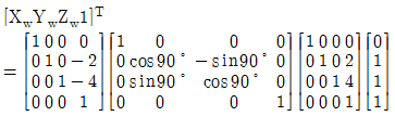 61. 공간의 한 물체가 세계 좌표계의 x축에 평행하면서 세계좌표(0, 2, 4)를 통과하는 축에 관하여 90° 회전된다. 그 물체의 한 점이 모델 좌표 (0, 1, 1)을 가지는 경우, 회전 후에 같은 점의 세계 좌표를 구하는 식으로 적절한 것은?