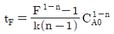 104. 회분식 반응기에서 반응시간이 tF일 때 CA/CA0의 값을 F라 하면 반응차수 n과 tF의 관계를 옳게 표현한 식은? (단, k는 반응속도상수 이고, n≠1 이다.)