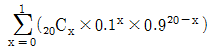 22. 하나의 로트에서 시료를 1번 취할 때 부적합품질이 0.1로 일정할 경우 20개의 표본 중 부적합품이 1개 이하일 확률을 구하는 식으로 옳은 것은?