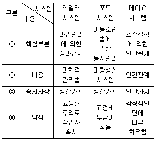 60. 다음의 표는 Taylor, Ford 그리고 Mayo 시스템을 비교한 것이다. 내용 중 틀린 것은?