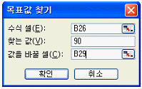 39. 목표값 찾기 기능을 이용하려고 한다. 다음 중 "평균이 90점이 되기 위해서 생물 성적이 몇 점이 되어야 하는가?"에 대한 목표값 찾기 대화 상자로 옳은 것은?
