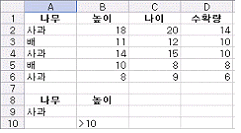 38. 다음 시트의 [D10] 셀에서 =DCOUNT(A1:D6,3,A8:B10) 을 입력했을 때 결과 값으로 옳은 것은?