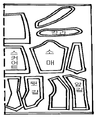 59. 슈우트의 마름질 그림이다. 몇 cm폭의 옷감으로 마름질한 것인가?