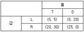 66. 갑과 을의 동시선택게임에서 전략이 각각 L, R과 T, D일 때, 다음 설명 중 옳은 것은? (단, 괄호 안 왼쪽은 갑, 오른쪽은 을의 보수)