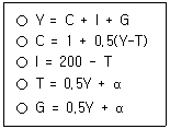 42. 아래의 거시경제모형 초기 균형에서 외생적 정부지출(α)을 1만큼 증가시킬 때, 거시경제 변수의 변화에 관한 설명으로 옳지 않은 것은? (단, Y는 국민소득, C는 소비, I는 투자, G는 정부지출, T는 조세)