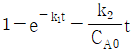 37. A가 R을 거쳐 S로 반응하는 연속반응과 A와 R의 소모 및 생성 속도 아래와 같을대, 이 반응을 회분식 반응기에서 반응시켰을 때의 CR/CA0는? (단, 반응 시작 시 회분식 반응기에는 순수한 A만을 공급하여 반응을 시작한다.)