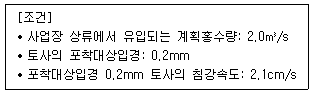 58. 개발사업장에 침사지 겸 저류지를 설치하여 사업지역 하류부에 대한 2차 토사재해를 저감하고자 한다 [조건]을 활용할 때 침사지의 최소 소요수 면적(m2)은?