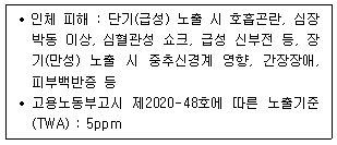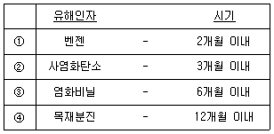 132. 「연구실 안전환경 조성에 관한 법령」에서 규정하는 특수건강검진 대상 유해인자를 취급하는 연구활동종사자는 특수건강검진을 받야야 한다. 연구활동종사자가 유해인자를 취급한 후 특수 건강검진을 받아야 하는 유해인자와 첫 번째 특수건강검진 시기의 연결이 옳지 않은 것은?