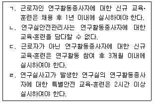 6. 「연구시 안전환경 조성에 관한 법령」에서 규정하는 연구활동종사자에 대한 교육‧훈련에 관한 설명으로 옳은 것을 <보기>에서 모두 고른 것은?