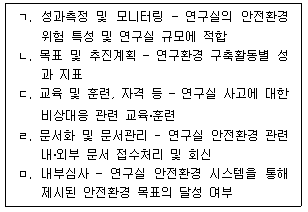15. 「연구실 안전환경 조성에 관한 법률 시행령」에서 규정하는 안전관리 우수연구실 인증 기준으로 옳지 않은 것은?