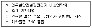 28. 사전유해인자위험분석을 실시하는 연구실에서 연구실 안전현황표에 반드시 작성하여야 하는 내용만을 <보기>에서 모두 고른 것은?
