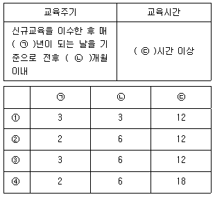 26. 다음은 「연구실 안전환경 조성에 관한 법률 시행규칙」에서 규정하는 연구실안전환경관리자 보수교육의 주기 및 시간에 관한 사항이다. ( ) 안에 들어갈 숫자로 옿은 것은?