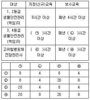 100. 다음은 「연구실안전 및 생물안전 관리 등에 관한 규정」에 따른 대상별 생물안전 관련 법정교육 시간에 관한 내용이다. ( ) 안에 들어갈 숫자로 옳은 것은?