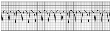 28. 56세 여자가 어지러움을 동반한 의식장애를 보인다. 혈압이 65/40 mmHg이고 심전도가 다음과 같을 때, 시행해야 할 처치로 옳은 것은?