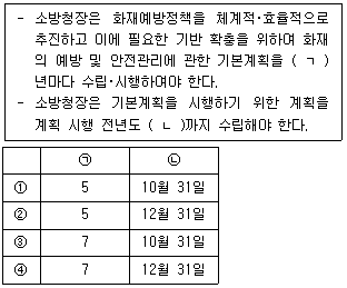 17. 「화재의 예방 및 안전관리에 관한 법률」 및 같은 법 시행령상 화재의 예방 및 안전관리 기본계획 등의 수립・시행에 관한 설명이다. 'ㄱ, ㄴ'에 들어갈 내용으로 옳은 것은?