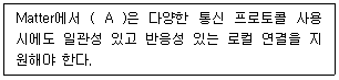 18. 다음은 Matter에서 추구하는 4가지 구현 가치 중 하나에 대한 설명이다. (A)에 들어갈 알맞은 용어는?