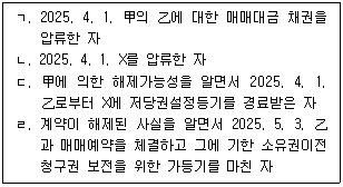 31. 甲은 2025. 3. 1. 乙에게 甲소유의 X토지를 매도하고 2025. 3. 7. 乙명의로 소유권이전등기를 경료해 주었는데, 2025. 5. 1. 위 매매계약이 적법하게 해제되었다. 이 경우 해제의 소급효로부터 보호받는 제3자에 해당하지 않는 자를 모두 고른 것은? (다툼이 있으면 판례에 따름)