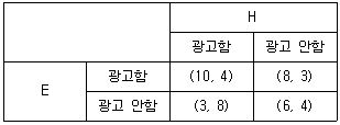 16. 동일한 브랜드의 가전제품을 경쟁적으로 판매하고 있는 두 마트(mart) E와 H는 이윤을 극대화하기 위해 광고 전략을 고려하고 있다. 다음은 두 마트가 전략을 동시에 선택할 경우 얻게 되는 보수행렬이다. 이에 관한 설명으로 옳지 않은 것은? (단, E와 H는 전략을 동시에 선택하고 합리적으로 행동하며 본 게임은 1회만 행해진다. 괄호 안의 왼쪽 값은 E의 보수, 오른쪽 값은 H의 보수를 나타낸다.)