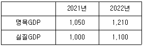 22. 다음 표에 관한 설명으로 옳지 않은 것은? (단, 2020년의 GDP디플레이터는 100이다.)