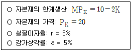 31. 아래 이윤극대화의 원리에 따라 투자수준을 결정하는 신고전파 투자모형(neoclassical model of investment)하에서 기업가가 구입하고자 하는 적정 자본재(K)수준은? (단, 자본재 가격이 다른 상품가격과 함께 상승하고 물가수준은 1 이라고 가정한다.)