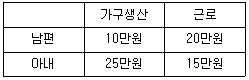 33. 아내와 남편으로 구성된 가구에서 노동시장 근로(labor)와 가구생산(household production)에 쓸 수 있도록 각자에게 10시간씩 주어졌다. 각각의 활동에 10시간을 투입했을 때 생산할 수 있는 가치는 각각 다음과 같다.
