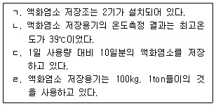 18. 소독제(액화염소) 저장 및 주입설비에서의 관리상황이 옳은 것을 모두 고른 것은?