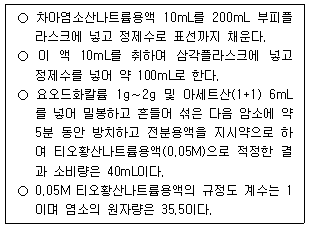 27. 다음의 자료를 이용하여 계산한 차아염소산나트륨의 유효염소 농도(%)는?