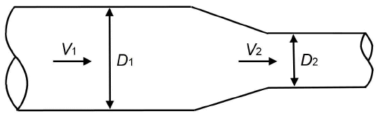 64. 관수로 흐름의 유량이 0.5m3/sec일 때, 각 단면에서의 유속(m/sec)은 약 얼마인가? (단, D1=50cm, D2=30cm이다.)