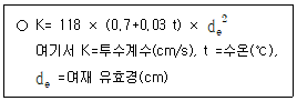 78. 여과지 면적 150m2인 중력식 모래여과지에 물을 여과하고자 한다. 여재 유효경 0.52 mm, 여층두께 70 cm, 사면상 수심과 유출부의 수위차는 30 cm일 때, 여과량(m3/h)은? (단, 수온은 5℃이고 투수계수 K는 아래 식으로 결정한다.)