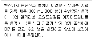 24. 수질오염공정시험기준에서 용존산소 시료의 보관방법에 관한 설명이다. ( )에 들어갈 내용을 순서대로 나열한 것은?