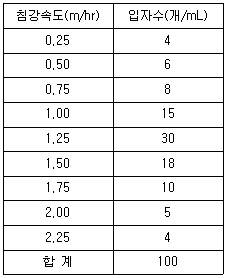 3. 정수장에서 횡류식 침전지로 유입되는 응집플록의 침강속도와 입자수 분포가 아래와 같다. 표면부하율이 1 m/hr일 때 입자의 제거효율은 몇 %인가?