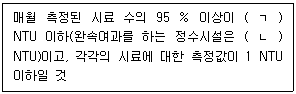 38. 수도법령상 일반수도사업자가 준수해야 할 정수처리기준 중 정수처리한 물의 탁도에 관한 기준이다. ( )에 들어갈 용어를 순서대로 나열한 것은?