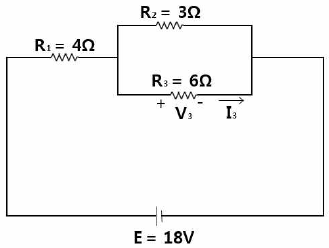 49. 저항 R1, R2, R3가 직ㆍ병렬로 연결된 회로에 18 V의 전원을 연결하였다. 저항 R3의 전압강하 V3(V)전류 I3(A)는?