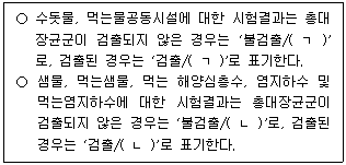 28. 먹는물수질공정시험기준상 총대장균군-효소기질이용법 결과표기에 대한 내용이다. ( )에 들어갈 내용은?